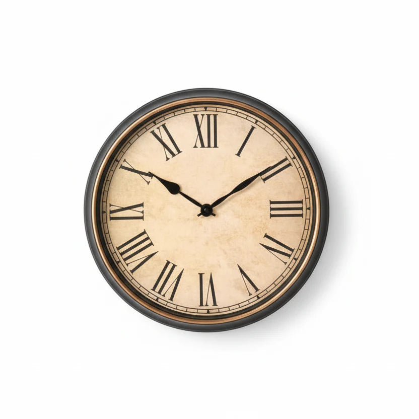 Kjo orë muri me dizajn klasik dhe numra romakë sjell elegancë dhe stil të përjetshëm në çdo ambient. Sfondi me efekt vintage dhe korniza e errët krijojnë një pamje të ngrohtë dhe tradicionale, duke e bërë të përshtatshme për ambiente klasike, rustike apo industriale.