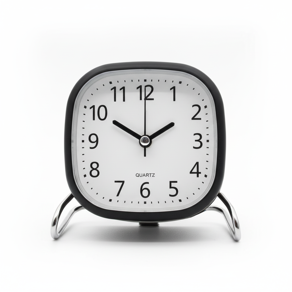 Ora analoge katrore me ekran të pastër dhe mbajtëse metalike është ideale për komodinë ose tavolinë, duke ofruar lexim të qartë të orës dhe funksion alarmi për zgjim të përditshëm.