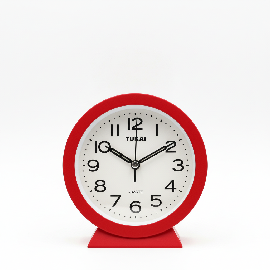 Kjo orë tavoline analoge me trup të kuq dhe fushë të bardhë ofron lexim të qartë të orës për komodinë ose tryezën tuaj. Dizajni i saj kompakt dhe i lirshëm e bën të përshtatshme për çdo ambient pune apo fjetjeje.