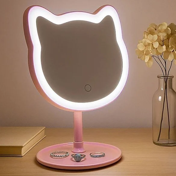 Pasqyrë me ndriçim me 31 LED në formë maceje, ngjyrë perlë rozë 19x18x30cm