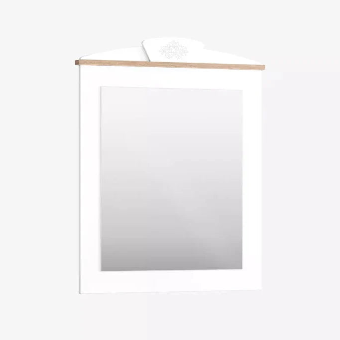 Kjo pasqyrë me dizajn të thjeshtë dhe elegant është një zgjedhje ideale për dhomën e gjumit. Korniza në ngjyrë të bardhë me detaj të lehtë dekorativ në pjesën e sipërme krijon një pamje të pastër dhe të harmonishme.