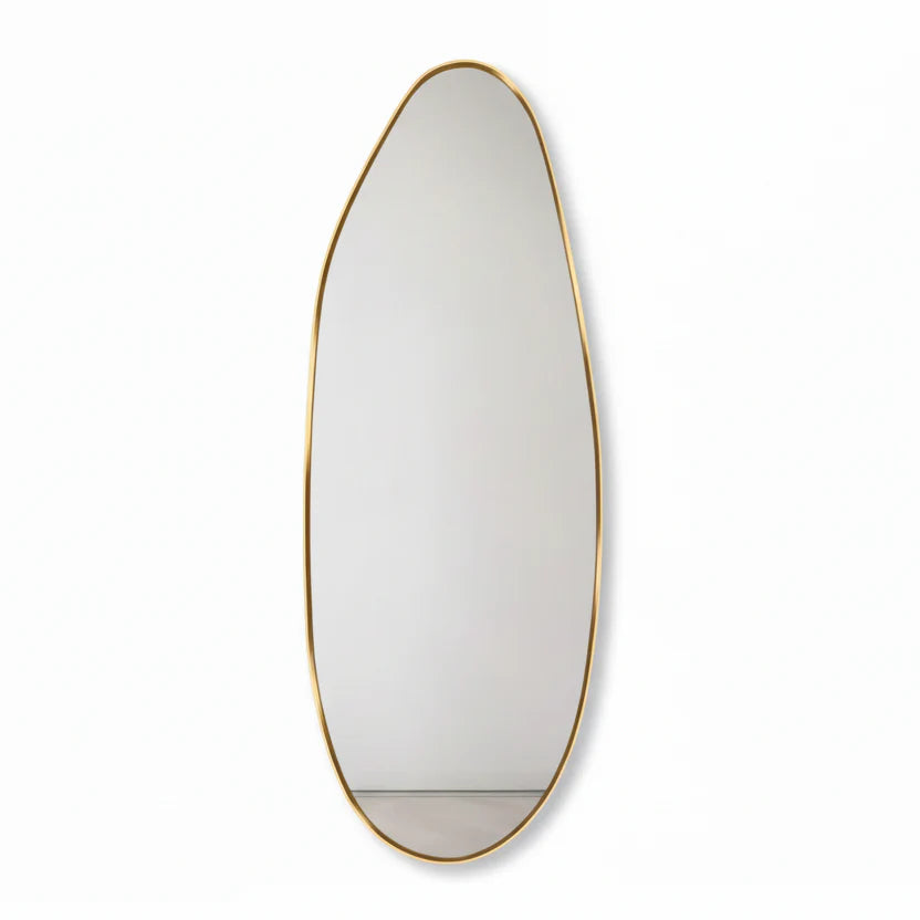 Një element elegant dhe modern që transformon çdo ambient. Kjo pasqyrë me formë organike dhe kornizë metalike në ngjyrë gold sjell stil bashkëkohor dhe finesë në hapësirën tuaj.