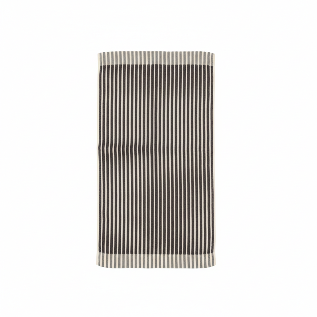 Peshqir dikëndor me vija vertikale gri dhe të bardha, me teksturë frotiri dhe dizajn të kthyeshëm për pamje të ndryshme. Kornizat anësore të rregullta i japin një përfundim të pastër dhe elegant.
