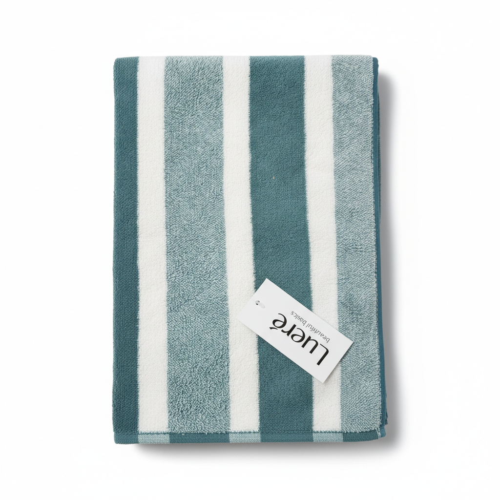 Peshqiri elegant me vija në nuanca teal dhe të bardhë sjell një prekje moderne në banjën tuaj, duke kombinuar stilin me funksionalitetin. Materiali prej frotiri (terry cloth) siguron tharje të shpejtë dhe ndjesi të butë në lëkurë gjatë përdorimit të përditshëm.