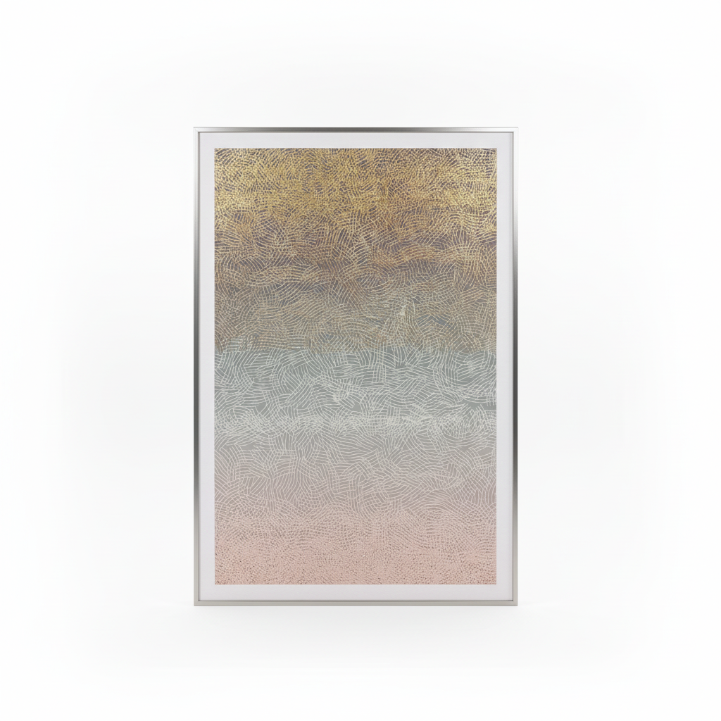 Tablo murale dekorative me dizajn abstrakt vijash dhe kalim ngjyrash nga tonet e arta tek pastel, e kompletuar me kornizë elegante. Formati i madh drejtkëndor e bën qendrën perfekte të çdo muri modern.