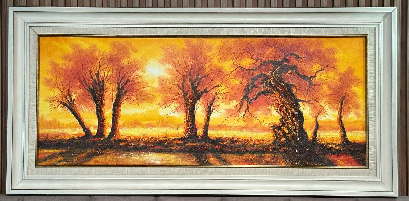 Kjo pikturë artistike me peisazh vjeshte shquhet për ngjyra të ngrohta ari, portokalli dhe të kuqe, që krijojnë një atmosferë intensive dhe emocionale. Pemët me degë të harkuara dhe drita e artë në sfond japin ndjesinë e qetësisë, reflektimit dhe bukurisë natyrore.
