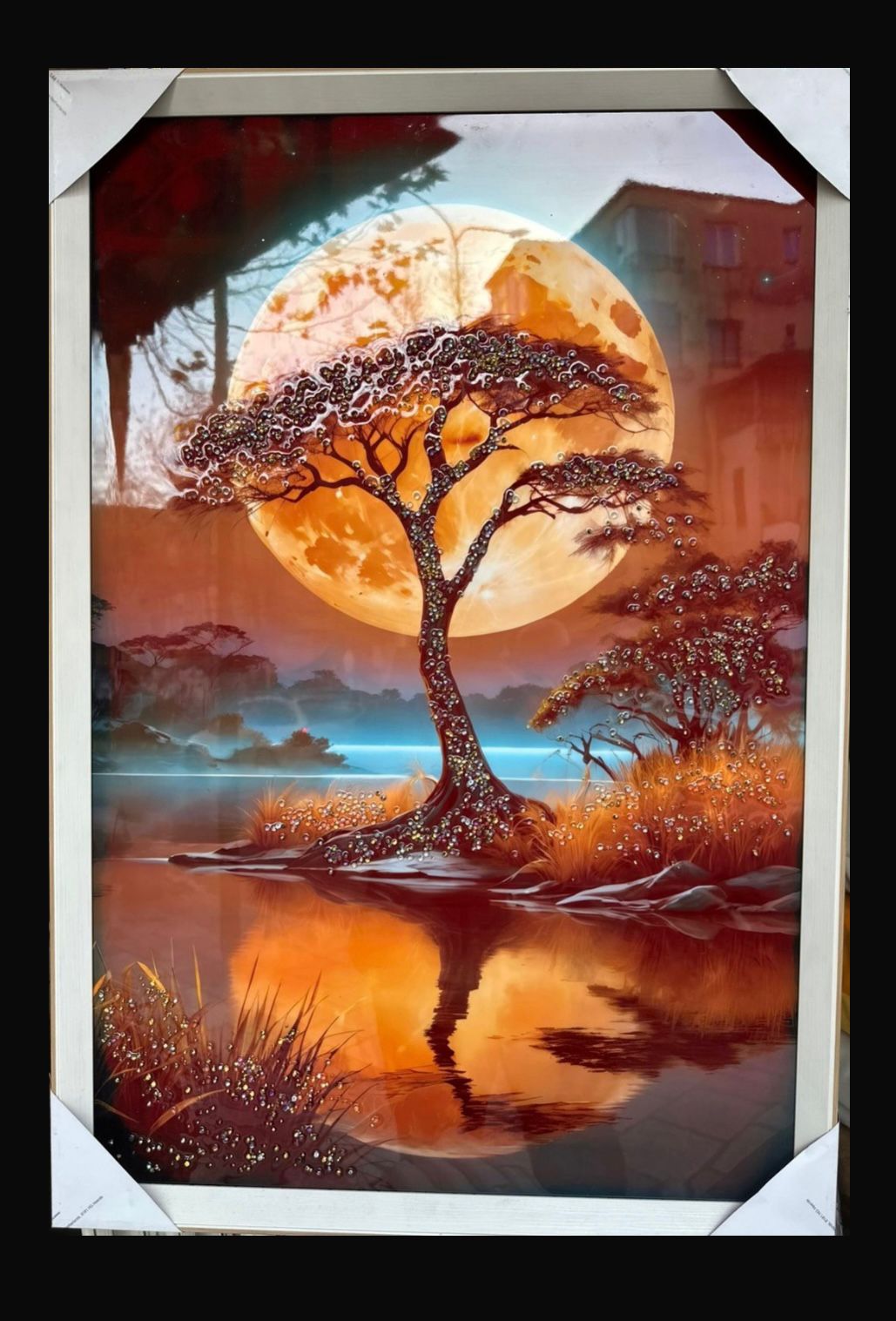 Kjo pikturë dekorative artistike paraqet një skenë poetike ku një pemë elegante shtrihet mbi një peizazh ujor, e ndriçuar nga një hënë e madhe me nuanca të arta. Reflektimi i dritës në sipërfaqen e ujit krijon një efekt vizual të thellë dhe harmonik, duke i dhënë veprës një ndjesi qetësie dhe misteri.