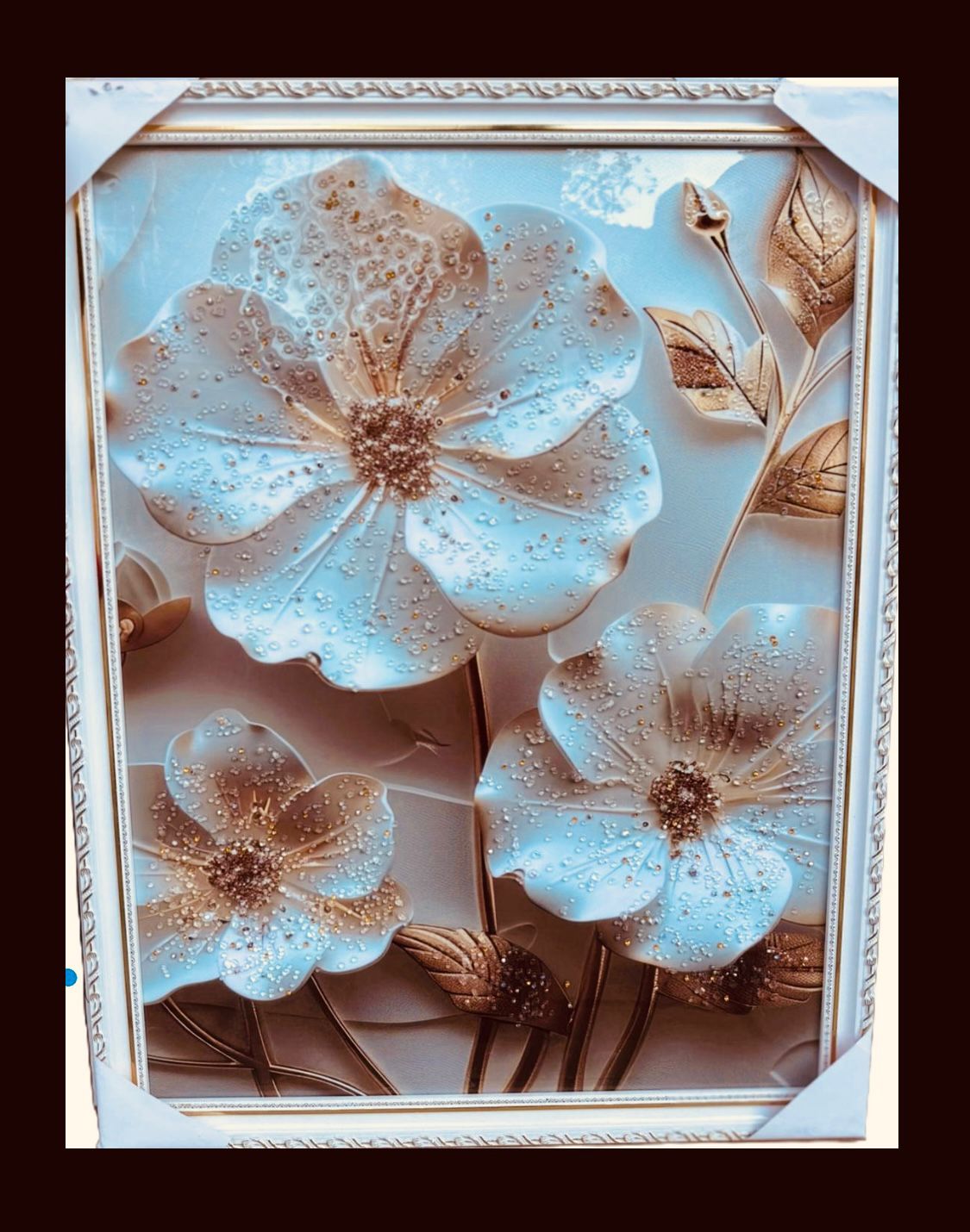 Kjo pikturë dekorative elegante paraqet lule të mëdha me nuanca blu të lehta, të kombinuara me detaje të arta dhe pika shkëlqyese që krijojnë një efekt tredimensional dhe shumë luksoz. Harmonia mes ngjyrave të buta dhe elementeve metalike i jep veprës një pamje të rafinuar dhe moderne.