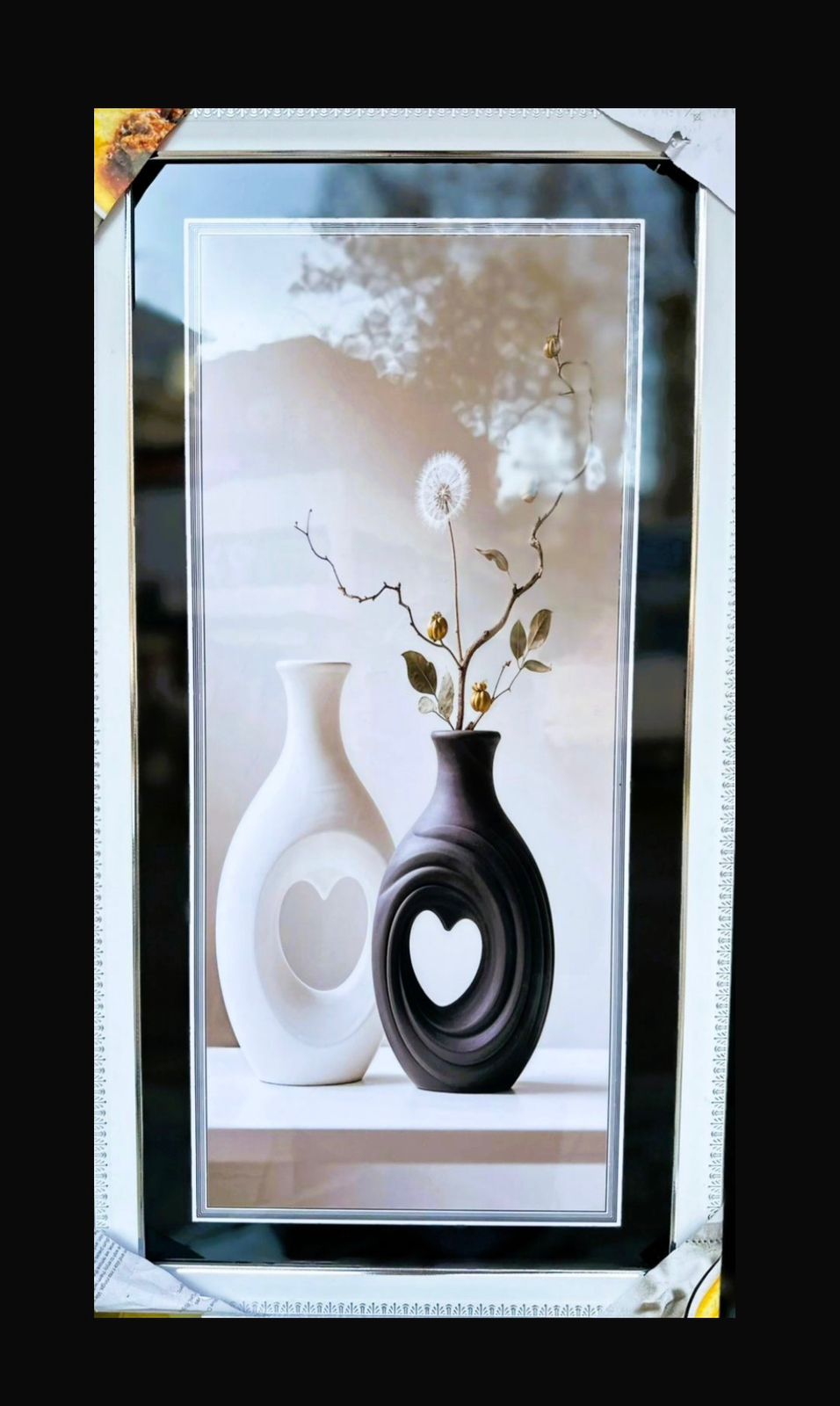 Kjo pikturë dekorative moderne paraqet një kompozim minimalist me dy vazo elegante në ngjyra bardhë dhe zezë, të kombinuara me elementë natyralë delikatë. Kontrasti i ngjyrave dhe format e pastra krijojnë një pamje harmonike dhe të rafinuar, duke i dhënë veprës një stil bashkëkohor dhe të ekuilibruar.