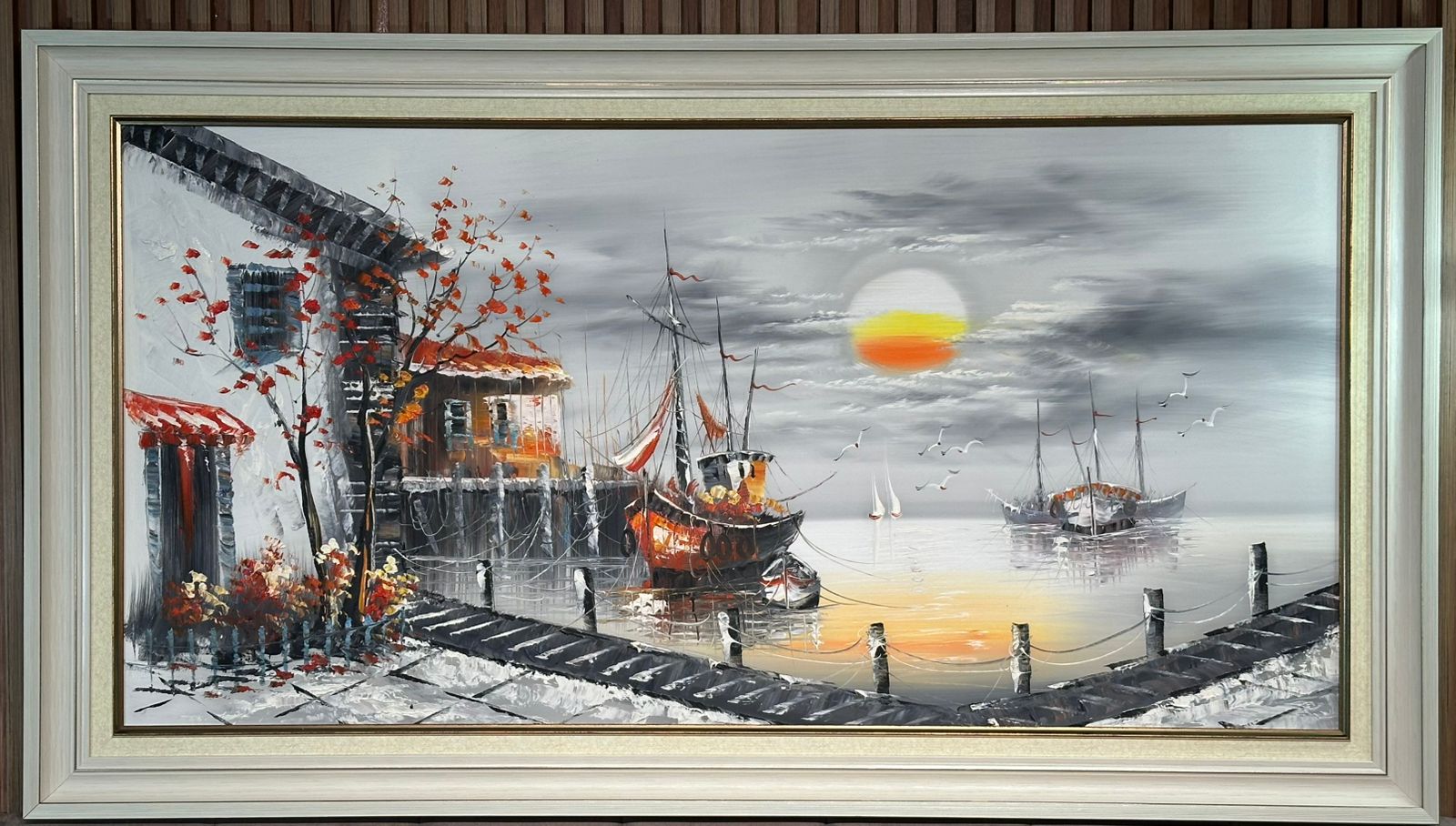 Kjo pikturë moderne me peisazh detar paraqet një port të qetë me varka peshkimi, shtëpi tradicionale bregdetare dhe një perëndim dielli që reflektohet mbi sipërfaqen e ujit. Kombinimi i toneve gri dhe neutrale me nuanca të ngrohta portokalli dhe të verdha krijon një kontrast elegant dhe shumë relaksues.