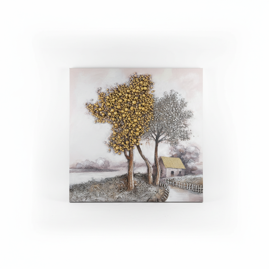 Pikturë dekorative në kanavacë me peizazh pemësh të punuara në relief, ku një pemë me kurorë të artë spikat mbi sfond në tonet neutrale. Ideale për të sjellë theks elegant dhe modern në çdo ambient të brendshëm.