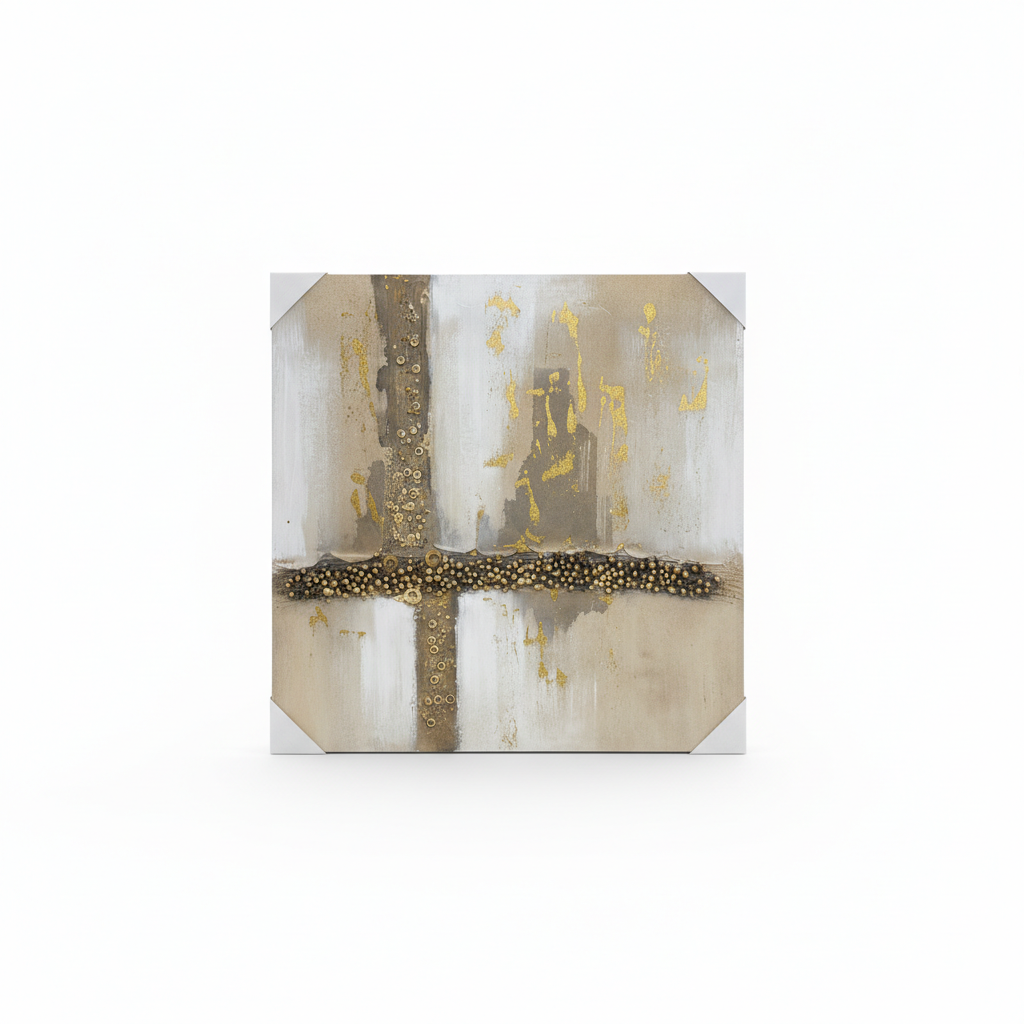 Kjo pikturë dekorative sjell një kompozim abstrakt me shirita vertikalë dhe horizontalë të punuar me teksturë të ngritur, duke krijuar një efekt elegant në mur. Tonet neutrale në bej, krem dhe gri ndërthuren me shkëlqimin e dekorimeve në nuanca ari për një pamje të sofistikuar dhe të lehtë për kombinim me mobiliet ekzistuese. Format i kanavacës katrore e bën ideale për t’u vendosur mbi divan, komodinë apo në hyrje. Produkti vjen gati për t’u varur, duke ju kursyer kohë dhe mundim në dekorimin e shtëpisë.