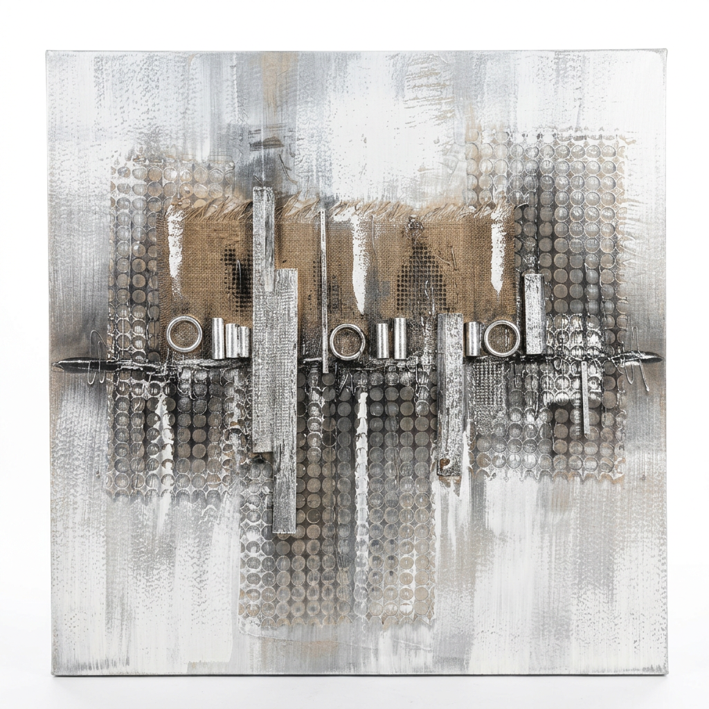 Kjo pikturë dekorative sjell një interpretim abstrakt të peizazhit urban, duke kombinuar forma gjeometrike dhe elementë linearë në një kompozim tërheqës. Ngjyrat neutrale të përziera me nuanca metalike argjendi e bëjnë të lehtë kombinimin me çdo stil mobilimi, nga moderni te industriali. Sipërfaqja me reliev 3D të teksturuar i jep thellësi dhe dimension, duke e shndërruar në një pikë fokale në dhomë. Formati i saj kanavacë katrore është ideal për sallon, hyrje apo zyrë.