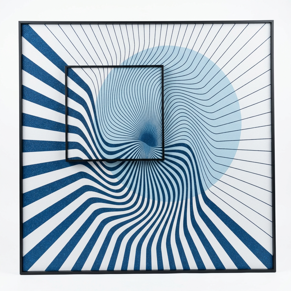 Kjo pikturë murale katrore sjell një dizajn abstrakt blu dhe të bardhë me iluzion optik, që tërheq vëmendjen dhe gjallëron çdo hapësirë. Vizat rrezatuese dhe rrethi qendror krijojnë një efekt hipnotizues, ndërsa korniza e brendshme katrore shton një ndjesi dimensioni dhe thellësie. Shtresa me shkëlqim/glitter e bën sipërfaqen të luajë me dritën, ideale si dekor modern për dhomë ndenjeje, zyrë ose korridor. E gatshme për t’u varur, pa nevojë për montim shtesë.