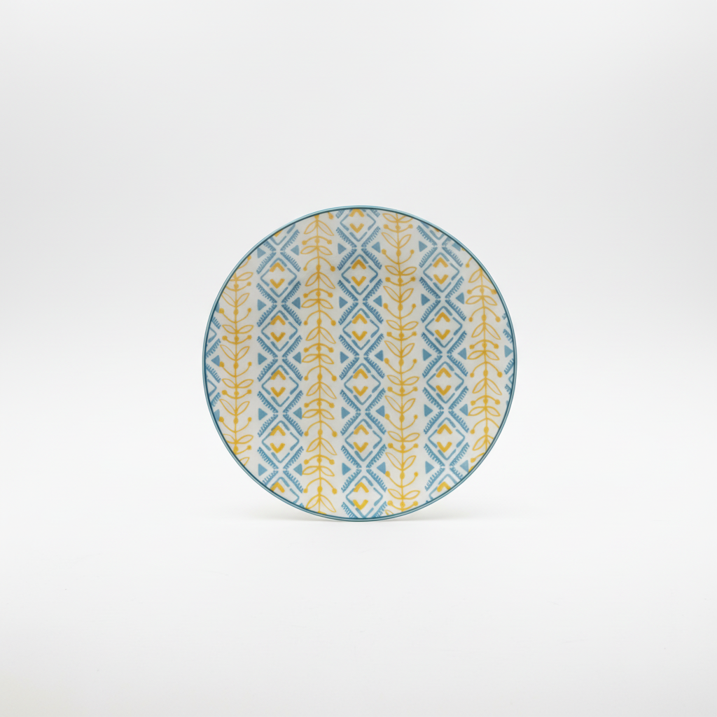 Pjatë e sheshtë 7.5" prej porcelani të imët me dekor blu dhe të verdhë, e përshtatshme për përdorim të përditshëm dhe servirje dekorative në tavolinë.