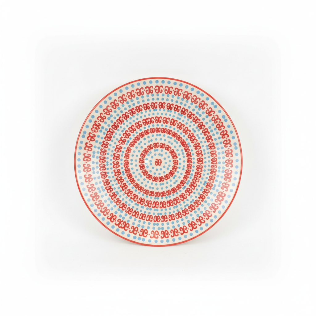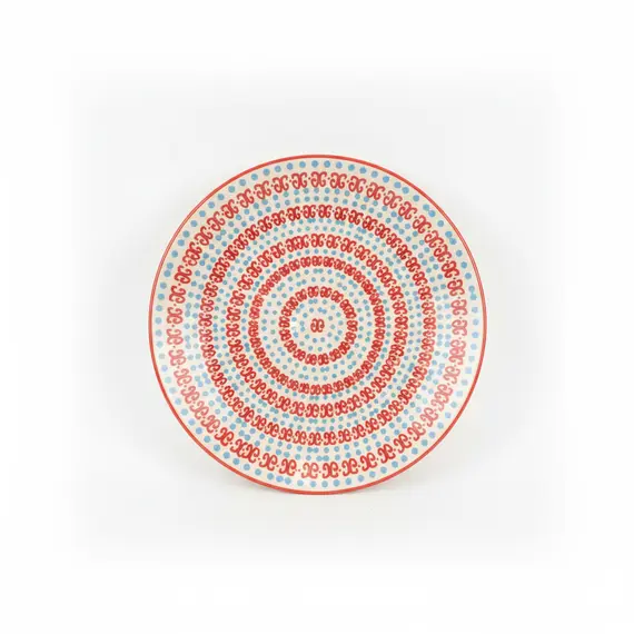 Pjatë e sheshtë qeramike 8.5" me dizajn shumëngjyrësh në rrathë koncentrikë të kuq dhe blu, ideale për servirje të përditshme ose për tavolinë dekorative. Pjesë e koleksionit Danny Home, sjell stil modern dhe ngjyra të gjalla në çdo vakt.