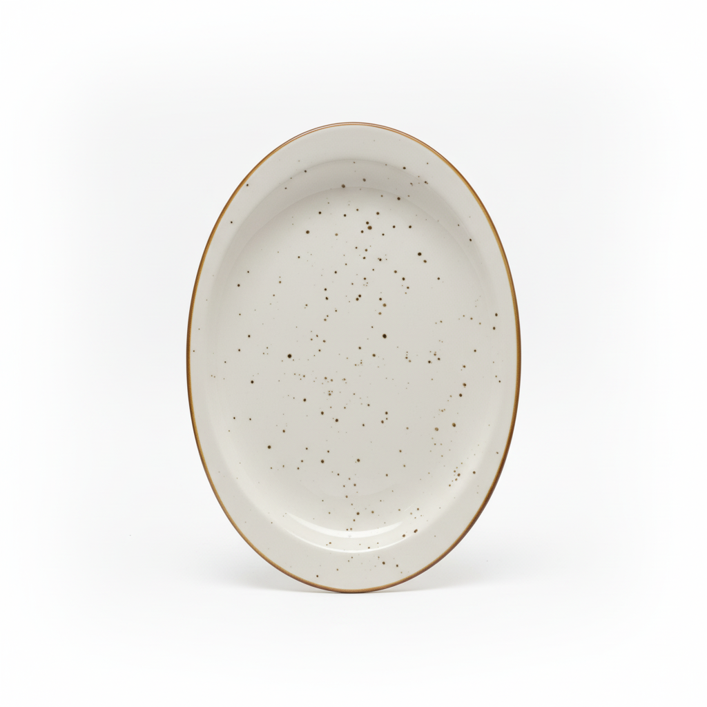 Kjo pjatë ovale qeramike me dizajn me pika dekorative sjell një stil të pastër dhe modern në çdo tavolinë. Ngjyra neutrale e bën të lehtë kombinimin me shërbime të ndryshme darke.