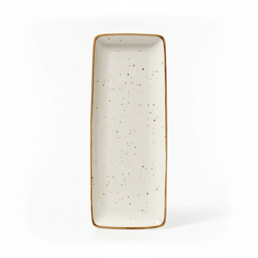 Pjata servirëse drejtkëndore Danny Home është ideale për prezantim elegant të mezeve, sushit apo garniturave. Dizajni i gjatë dhe i ngushtë me glaze të bardhë me pika kafe e bën perfekte për çdo tryezë moderne.