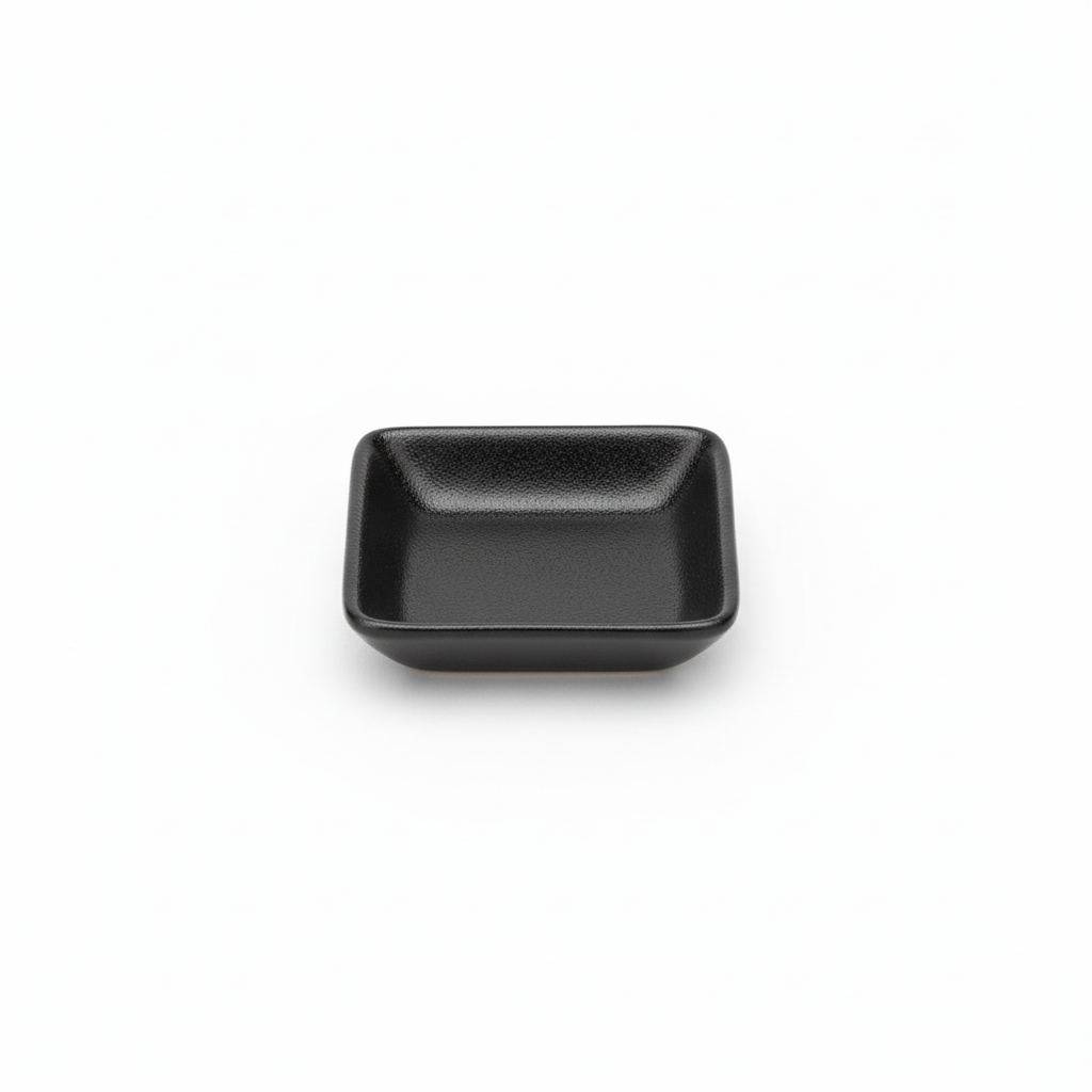 Pjatë e vogël porcelani në ngjyrë të zezë, me formë katrore dhe madhësi rreth 9.8 cm, ideale për servirjen elegante të sasive të vogla. Praktike për përdorim të përditshëm ose për tavolina të servuara me stil.