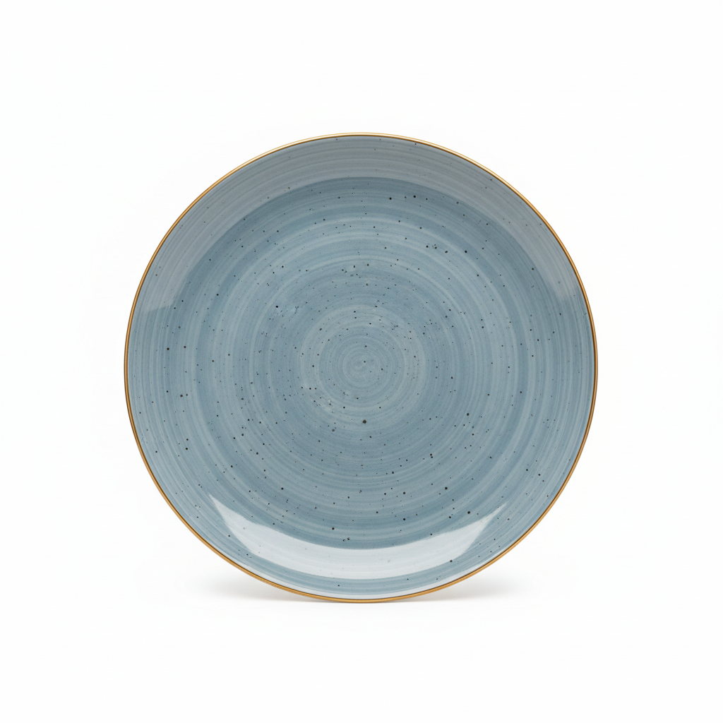 Pjata elegante prej porcelani me glaze blu të pikëzuar dhe buzë në ngjyrë ari sjell stil modern në çdo tryezë. E përshtatshme për përdorim të përditshëm dhe shërbim festiv.