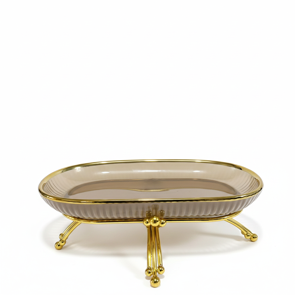 Shndërroni tavolinën tuaj në një vepër arti me këtë tabaka luksoze dekorative. Një ndërthurje perfekte e qelqit të nuancuar dhe metalit të artë, kjo pjesë është krijuar për të sjellë një frymë aristokrate në çdo ambient modern.