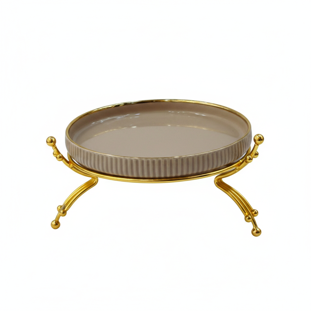 Shtoni një nuancë sofistikimi në interiorin tuaj me këtë pjatë dekorative luksoze. E krijuar për të qenë një element qendror që tërheq vëmendjen, kjo pjatë ndërthur thjeshtësinë e ngjyrave neutrale me shkëlqimin e artë, duke ofruar një pamje moderne dhe të kohës.