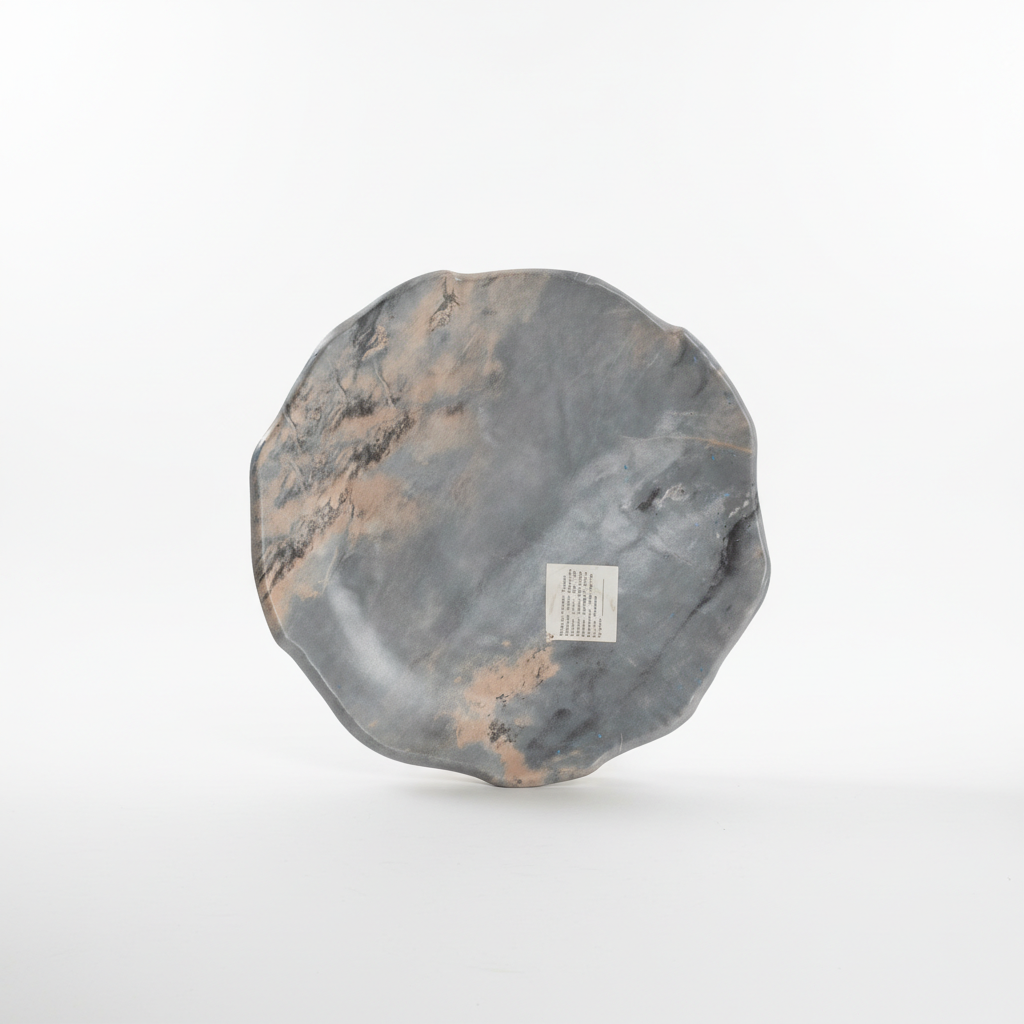 Pjatë dekorative rrethore me buzë organike të parregullt dhe sipërfaqe me efekt mermeri në nuanca gri dhe bezhë, ideale për dekor modern në çdo ambient. Prodhuar nga HULSEN dhe e destinuar vetëm për qëllime dekorative.