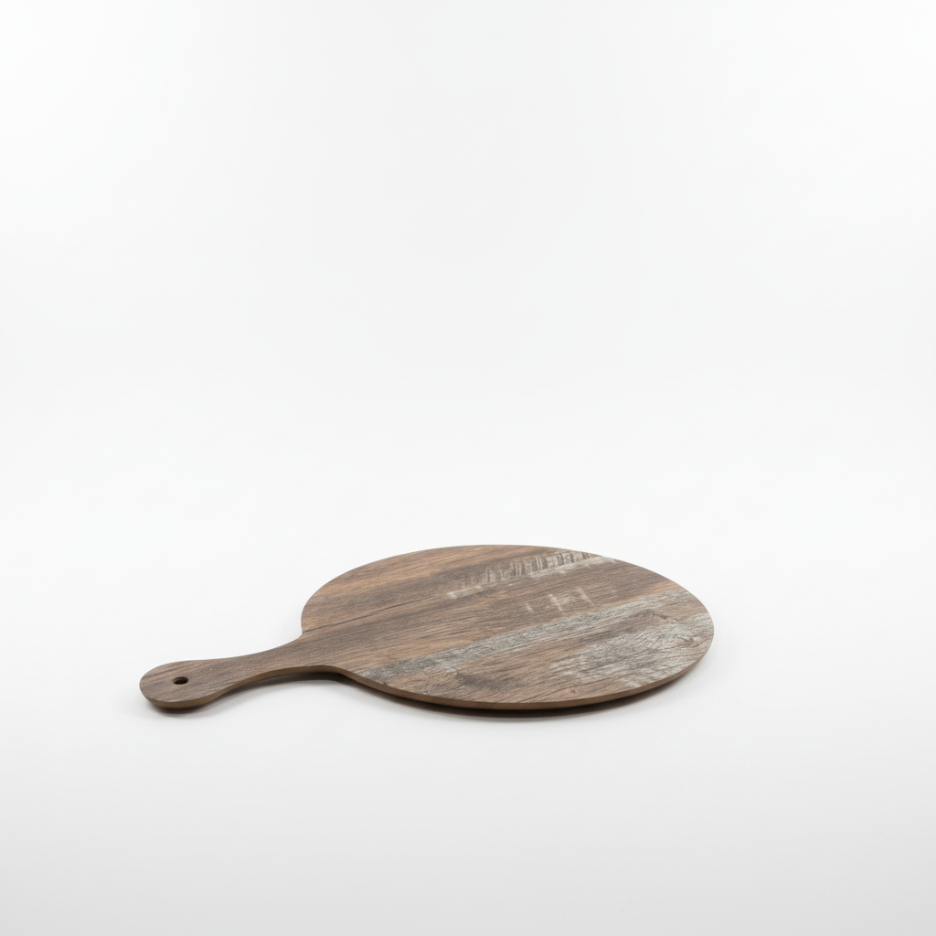Pjatë dekorative druri me formë rrethore dhe dorezë praktike, ideale për ekspozim elegant në çdo ambient shtëpie apo lokali.