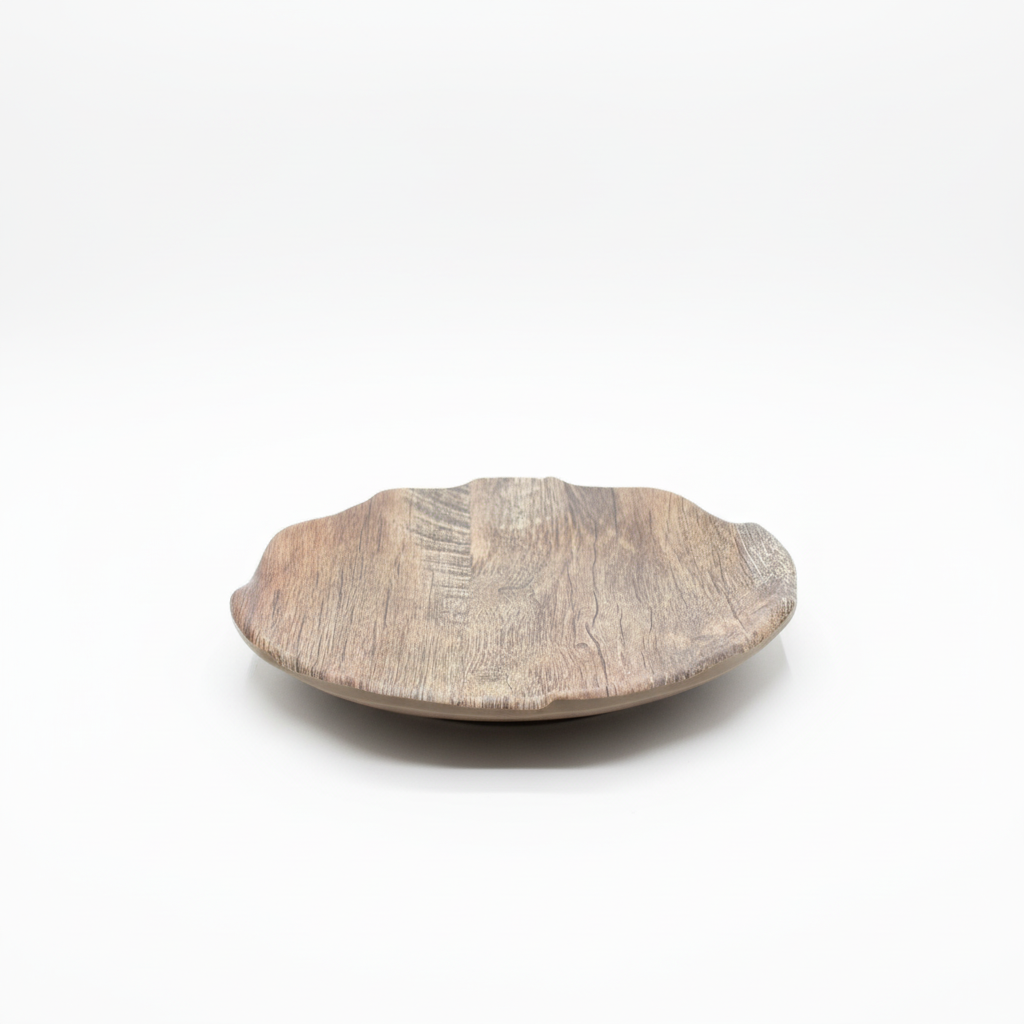Pjatë dekorative rrethore me pamje druri dhe buzë organike të parregullta, ideale për të shtuar një prekje natyrore në ambientin tuaj. E përshtatshme për vendosje mbi tavolinë, komodinë ose raft si aksesor decorativ.