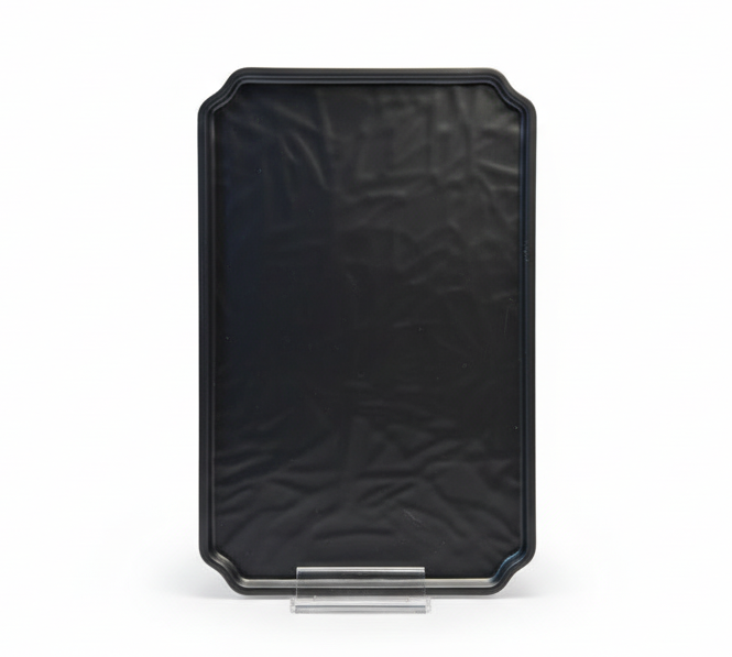 Pjate e ceket drejtkëndore në ngjyrë të zezë me dizajn modern dhe sipërfaqe me teksturë elegante. E përshtatshme për servirjen e ëmbëlsirave, ushqimeve të shpejta ose për përdorim dekorativ në tavolinë.