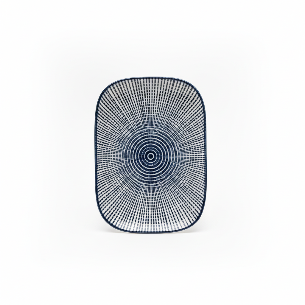 Pjatë ëmbëlsirash drejtkëndore rreth 5.8" me dizajn koncentrik vijash blu mbi sfond të bardhë, e përkryer për servirje moderne në çdo tavolinë. Materiali qeramik/porcelan i jep qëndrueshmëri dhe pamje elegante.
