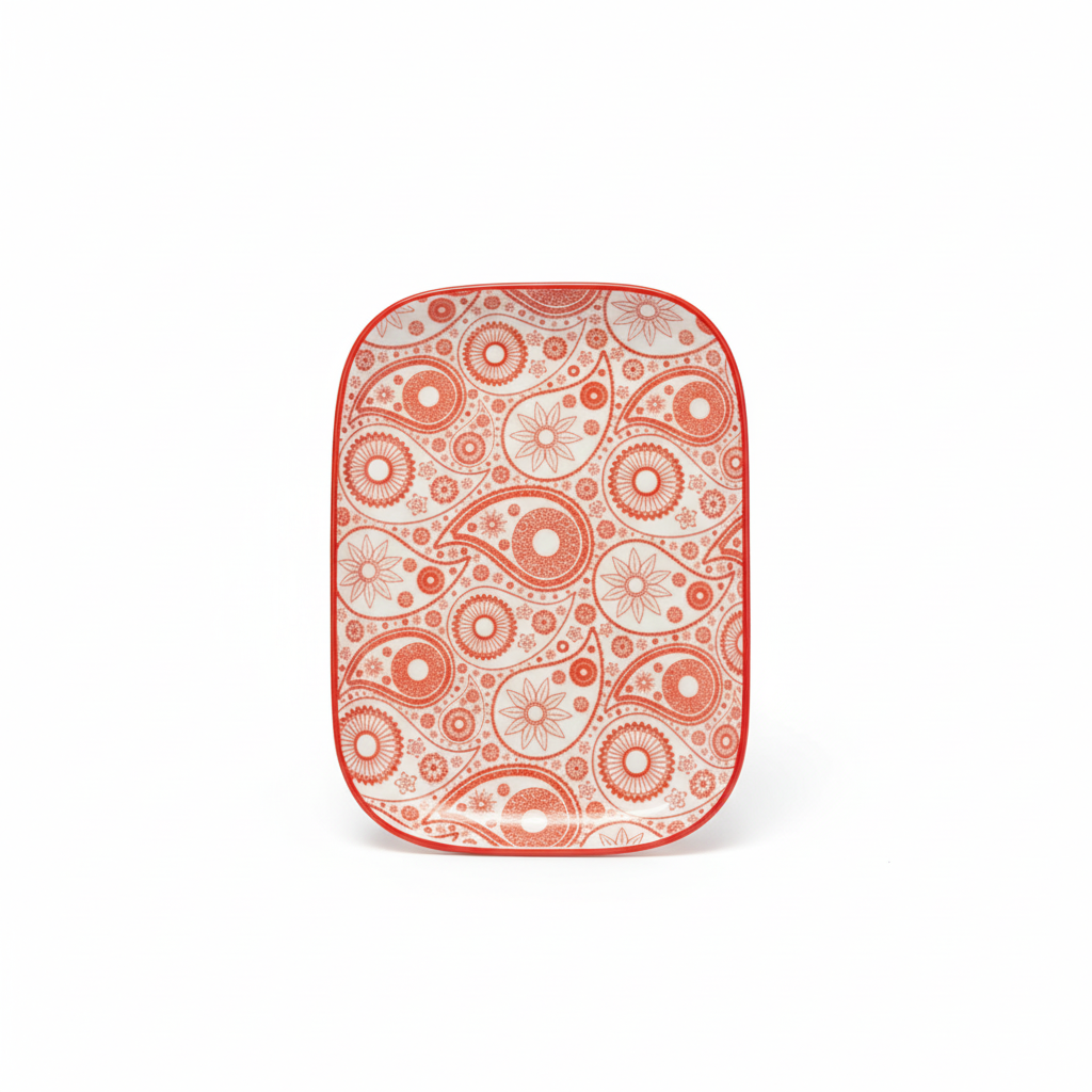 Pjatë ëmbëlsire prej porcelani 5.8" me formë katrore të rrumbullakosur dhe dekorim në ngjyrë të kuqe me motive lulesh dhe paisley, ideale për servirjen elegante të ëmbëlsirave. E përshtatshme për përdorim të përditshëm në çdo tryezë moderne.