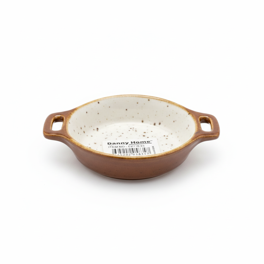 Pjata e thellë prej porcelani Danny Home 10.5 cm sjell një pamje elegante me ngjyrë të bardhë dhe buzë ari/kafe me pika dekorative. Forma e rrumbullakët dhe dorezat anësore e bëjnë praktike për servirje të ndryshme.
