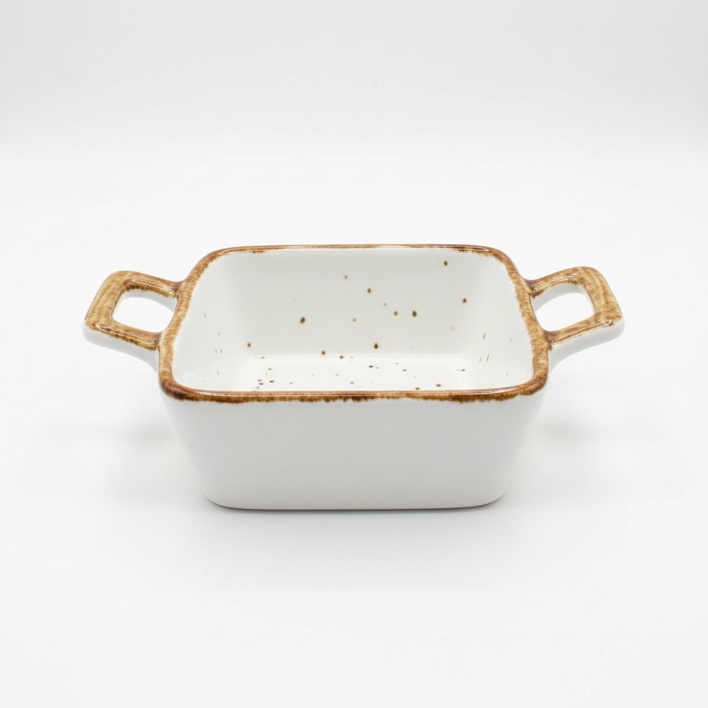 Pjatë e vogël katrore pjekjeje prej qeramike me dizajn të pikëzuar dhe buzë kafe që i jep stil servirjes individuale. Ideale për porcione të vogla dhe prezantim elegant në tryezë.