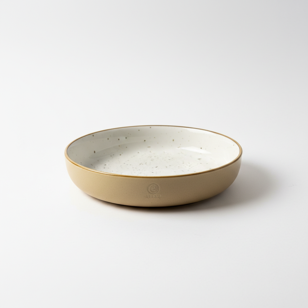 Pjatë e thellë porcelani me diametër 20 cm në ngjyrë të bardhë, e zbukuruar me pika kafe dhe buzë kontrastuese elegante. E përshtatshme për servirje të përditshme ose për prezantim më të rafinuar të vakteve.