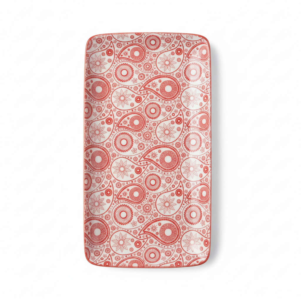 Kjo pjatë e thellë porcelani me formë katrori dhe dizajn dekorativ në ngjyrë bardhë/kuqe sjell një stil të veçantë në çdo tryezë. Modeli elegant me motive paisley dhe lulesh e bën ideale si për përdorim të përditshëm, ashtu edhe për servirje të veçantë për mysafirët. Madhësia rreth 23 cm ofron hapësirë të mjaftueshme për supa, sallata ose pjata kryesore.