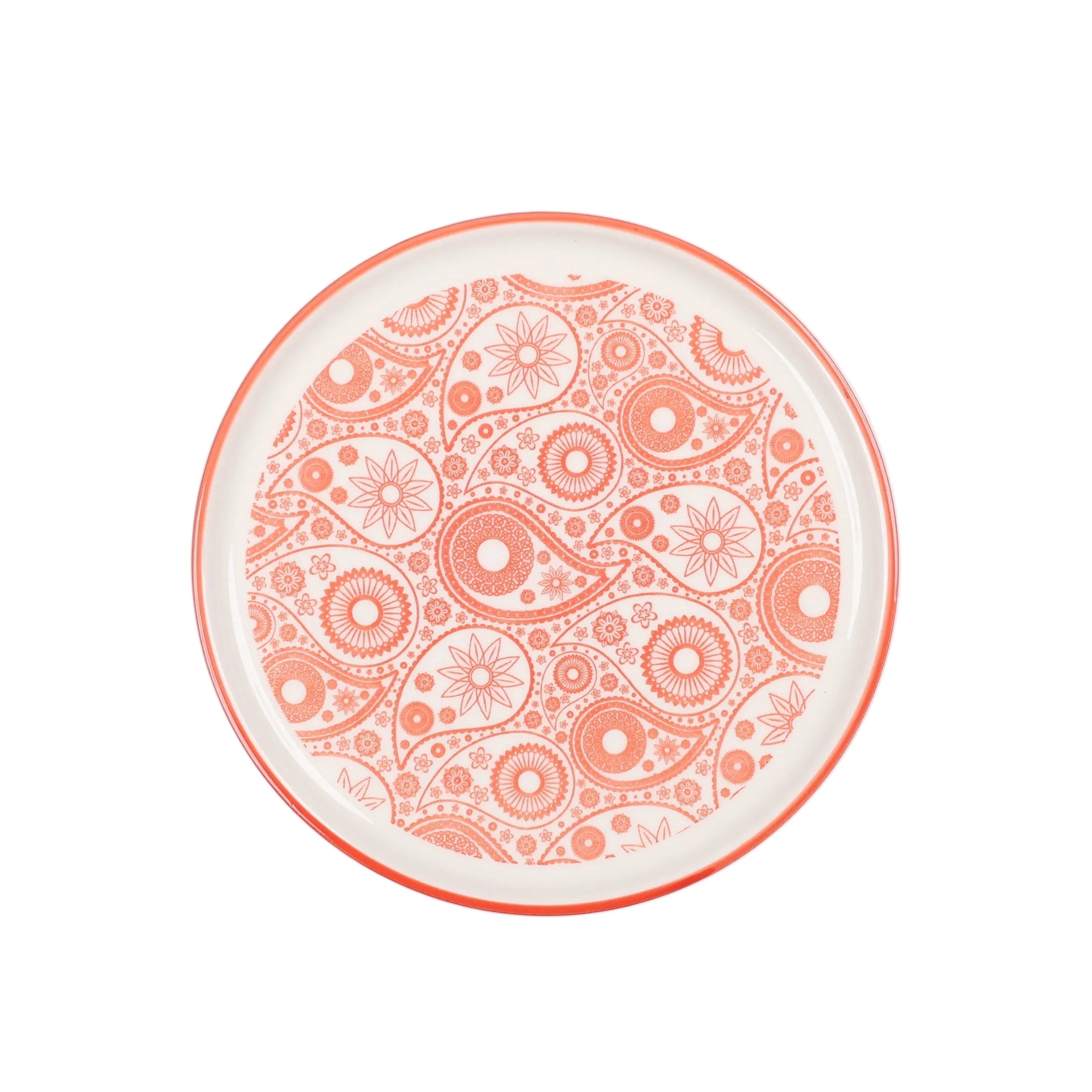 Pjatë elegante prej porcelani, ideale për servirjen e ëmbëlsirave, biskotave apo snack-eve. Dizajni dekorativ në ngjyrë kuqe mbi bazë të bardhë i jep një pamje moderne dhe tërheqëse tavolinës.