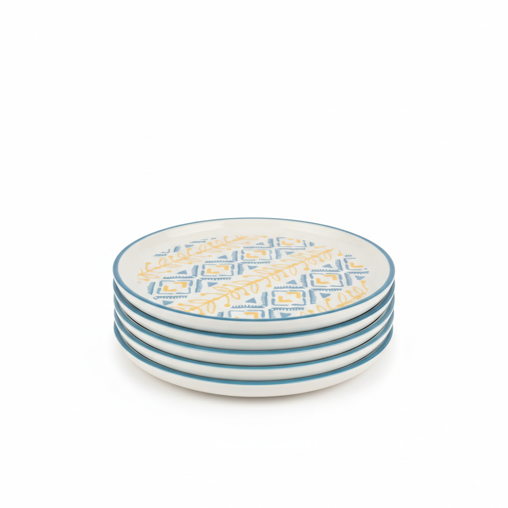 Kjo pjatë e rrumbullakët prej porcelani me diametër 15 cm sjell një prekje ngjyrash verdhe-blu që e bën çdo shërbim më të veçantë. Shtresa e glazuar i jep shkëlqim dhe e bën të lehtë për t’u pastruar, duke ruajtur njëkohësisht modelin dekorativ.
