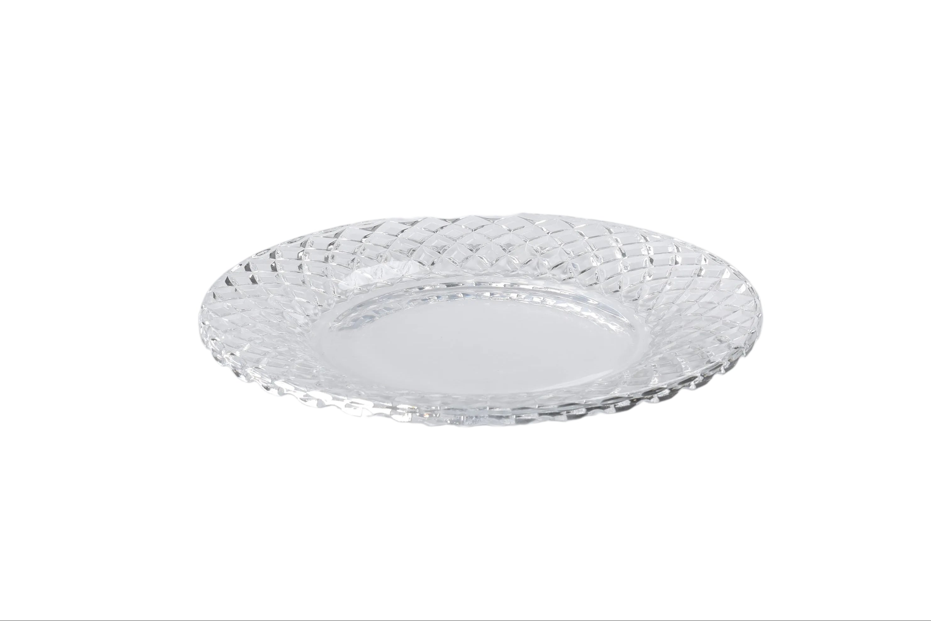 Pjatë elegante prej qelqi transparent me dizajn të gdhendur dekorativ, që reflekton bukur dritën dhe i jep tavolinës një pamje shumë luksoze dhe klasike.