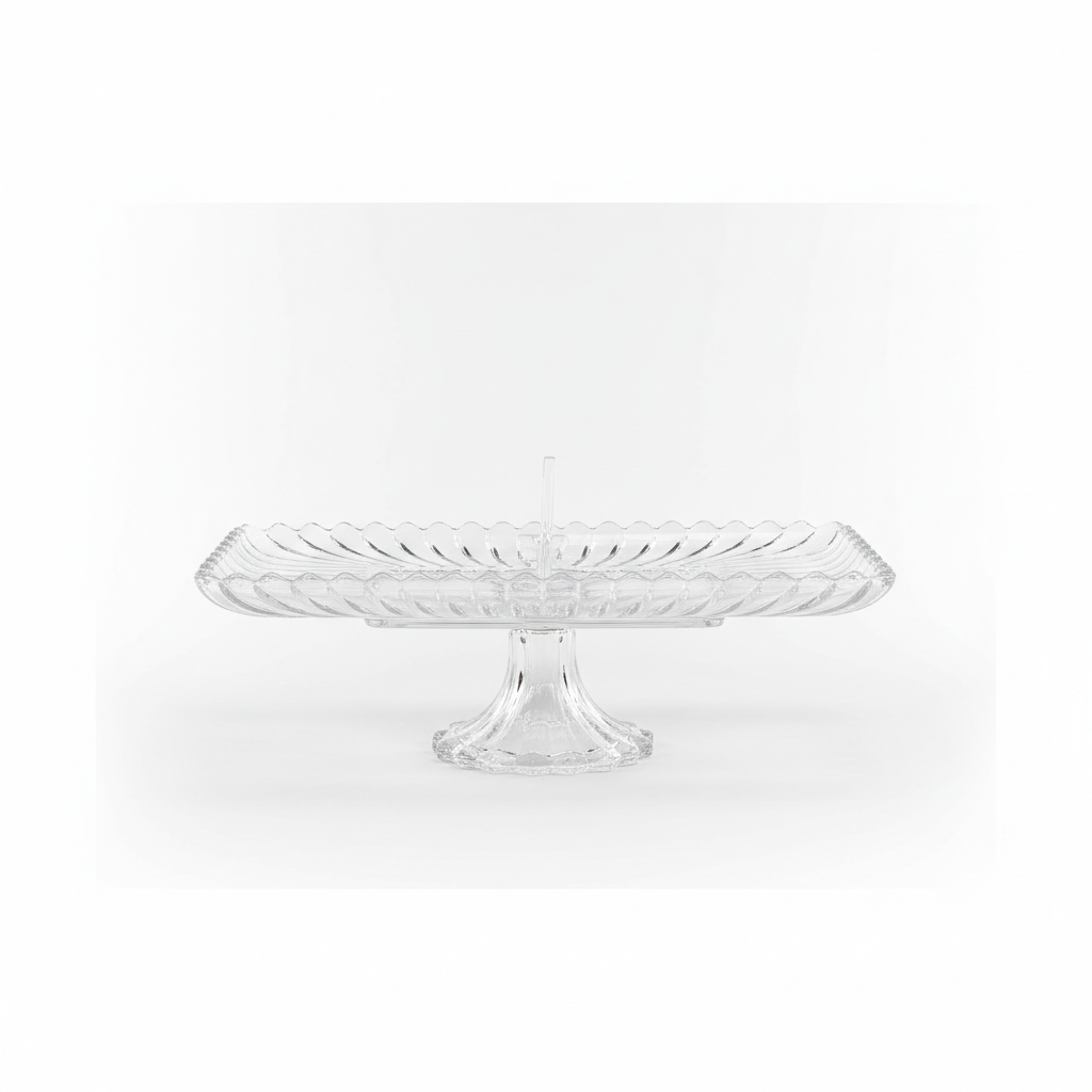 Pjatë frutash katrorë prej kristali me këmbë të ngritur, ideale për servirjen elegante të frutave, ëmbëlsirave apo snack-eve. Dizajni dekorativ me prerje xhami e bën të përshtatshme si për përdorim të përditshëm ashtu edhe për raste festive.