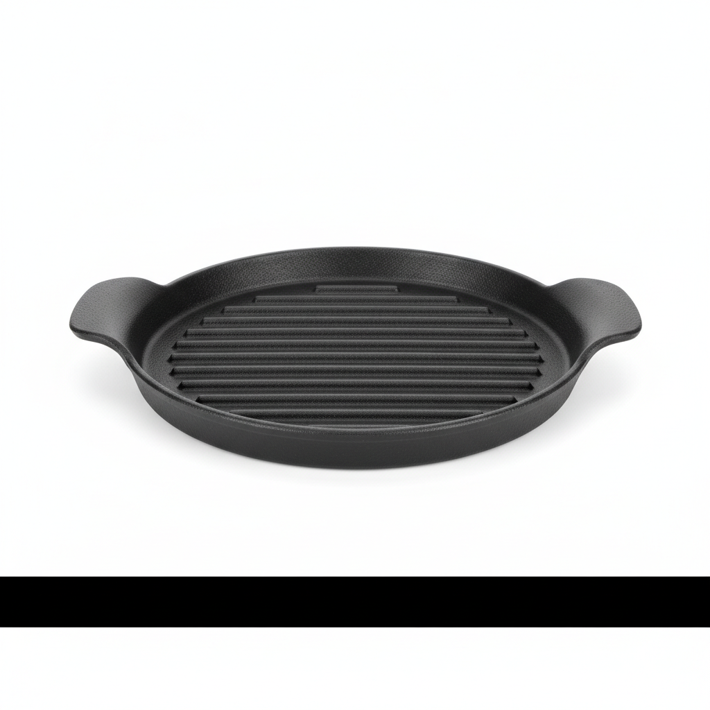 - Pjatë rrethore grili prej gize me sipërfaqe të rrudhur për pjekje pa ngjitje.