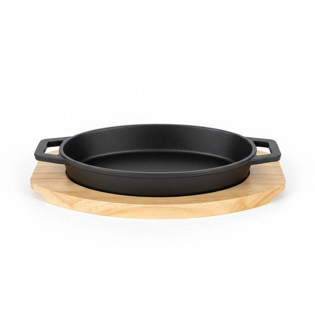 Kjo pjatë ovale prej gize të zezë është ideale për pjekje dhe gril në furrë ose mbi gril, dhe vjen me një bazë druri të përshtatur për servirje elegante direkt në tavolinë. Sipërfaqja e fortë siguron shpërndarje të mirë të nxehtësisë, ndërsa dorezat anësore të integruara e bëjnë më të lehtë transportin nga furra në tavolinë. Dizajni kompakt e bën të përshtatshme si për kuzhina shtëpiake ashtu edhe për ambiente profesionale. Struktura rezistente është menduar për përdorim të përditshëm dhe prezantim tërheqës të gatimeve tuaja.