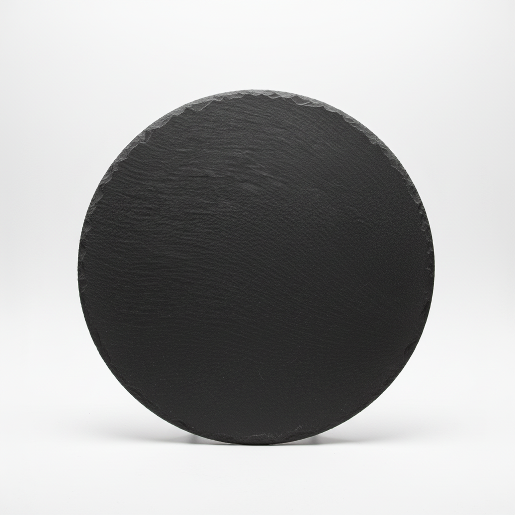 Pjatë rrumbullake servirjeje në ngjyrë gri të errët, me pamje gur shkrumbi, ideale si pjatë darke ose pjatancë prezantimi.