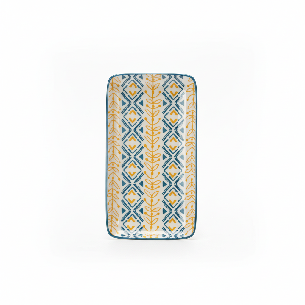 Pjatë drejtkëndore dekorative rreth 8" me model gjeometrik dhe gjethe në nuanca blu dhe të verdhë, ideale për servirje elegante të përditshme ose për mysafirë. E punuar nga qeramikë/porcelan i glazuruar nga koleksioni Danny Home.