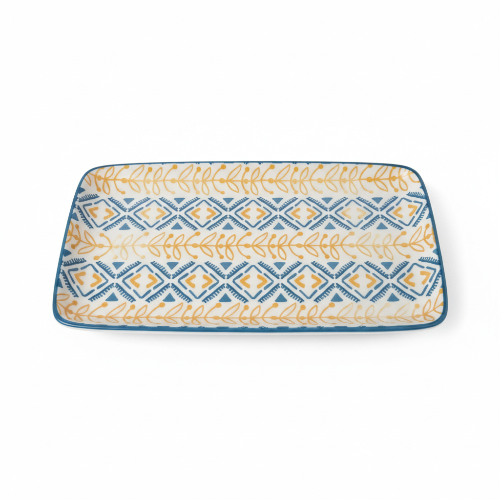 Kjo pjatë elegante servirjeje me formë drejtkëndore sjell ngjyra të gjalla verdhe-blu në çdo tryezë. E përkryer për servirjen e mezeve, ëmbëlsirave apo garniturave, ajo kombinon dizajn dekorativ modern me prakticitet ditor. Materiali i saj prej porcelani siguron qëndrueshmëri dhe pamje të rafinuar në çdo përdorim.