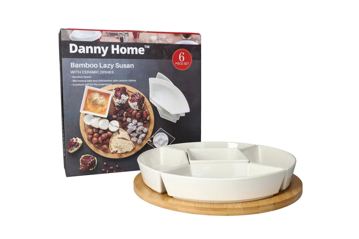 Set praktik Lazy Susan prej bambuje me tasa qeramike, ideal për festa familjare dhe evente.