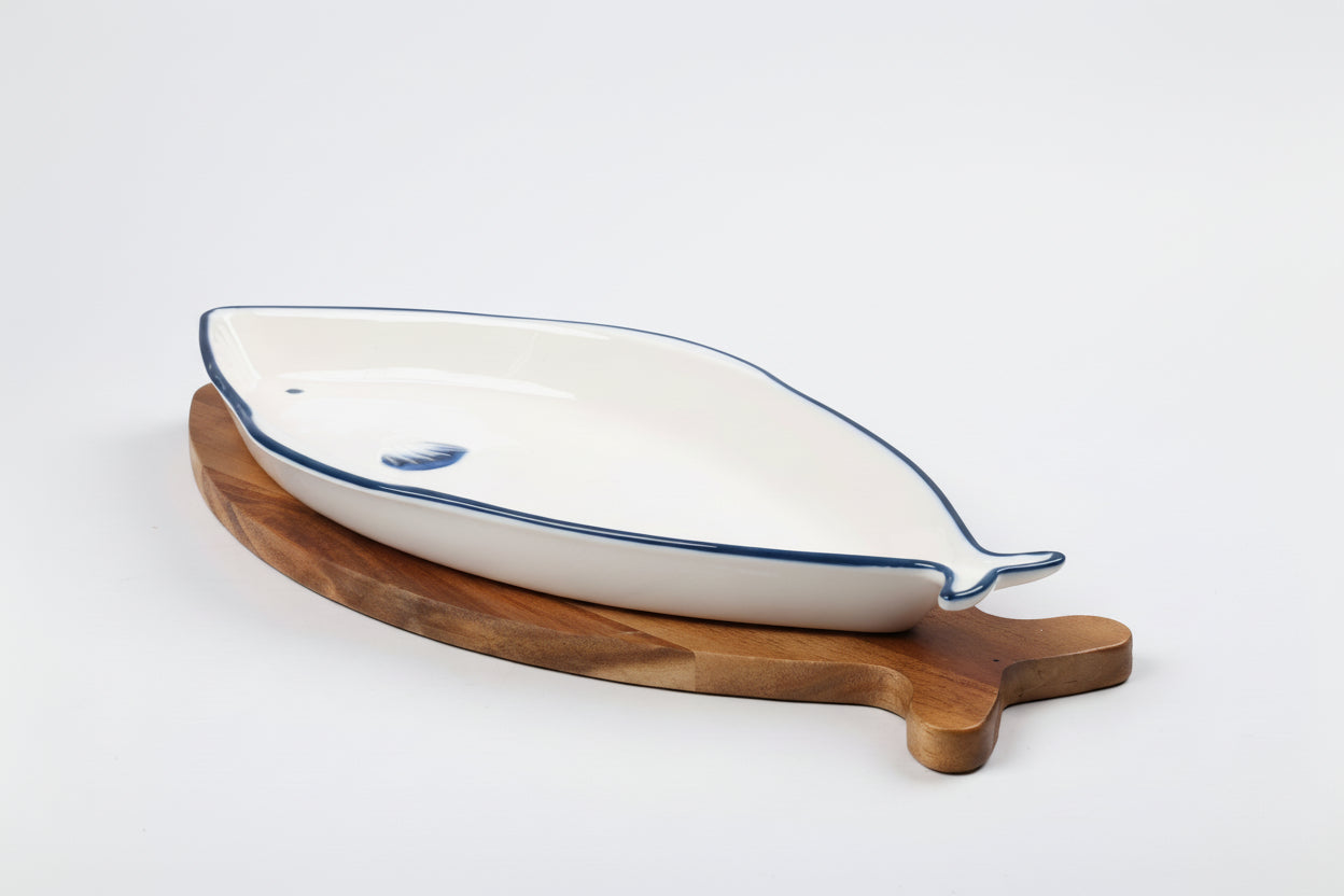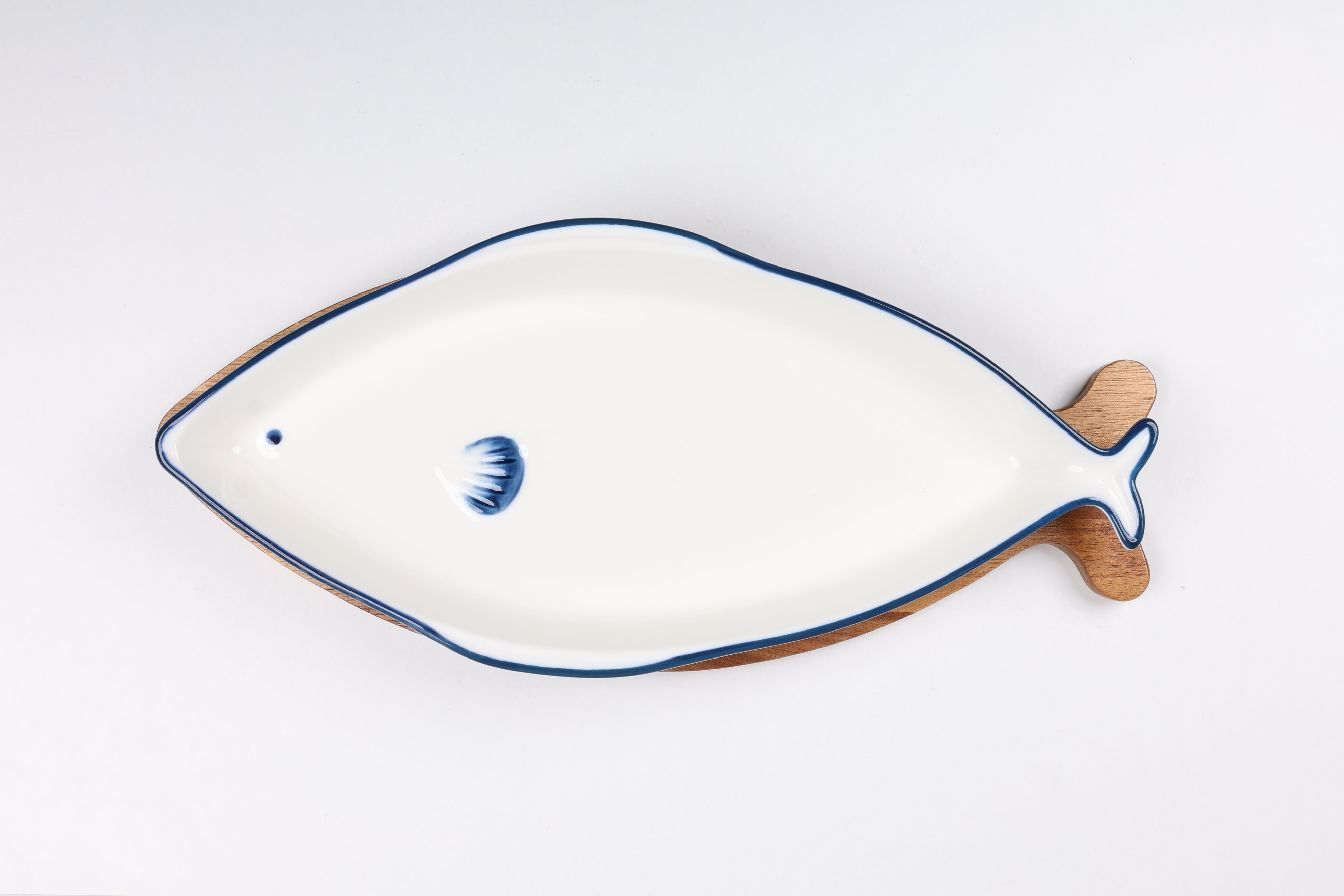 Pjatë shumë elegante dhe unike për servirje, me formë peshku dhe dizajn artistik. Kombinimi i porcelanit të bardhë me kontur blu dhe bazë druri natyral e bën perfekte si element funksional dhe dekorativ.