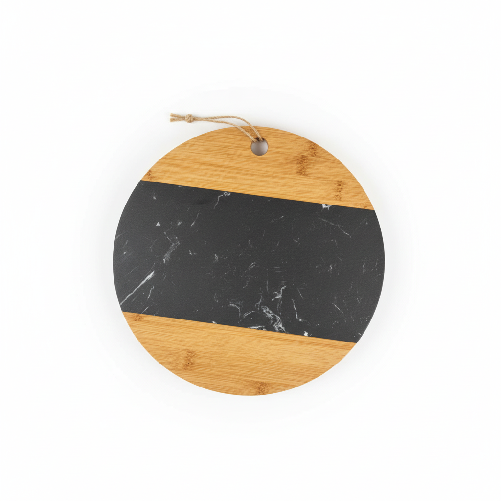 Dërrasa rrethore e servimit me kombinim mermeri dhe bambuje sjell stil modern në shtrimin e tavolinës, ideale për servirjen e djathërave, mezave apo snack-eve.