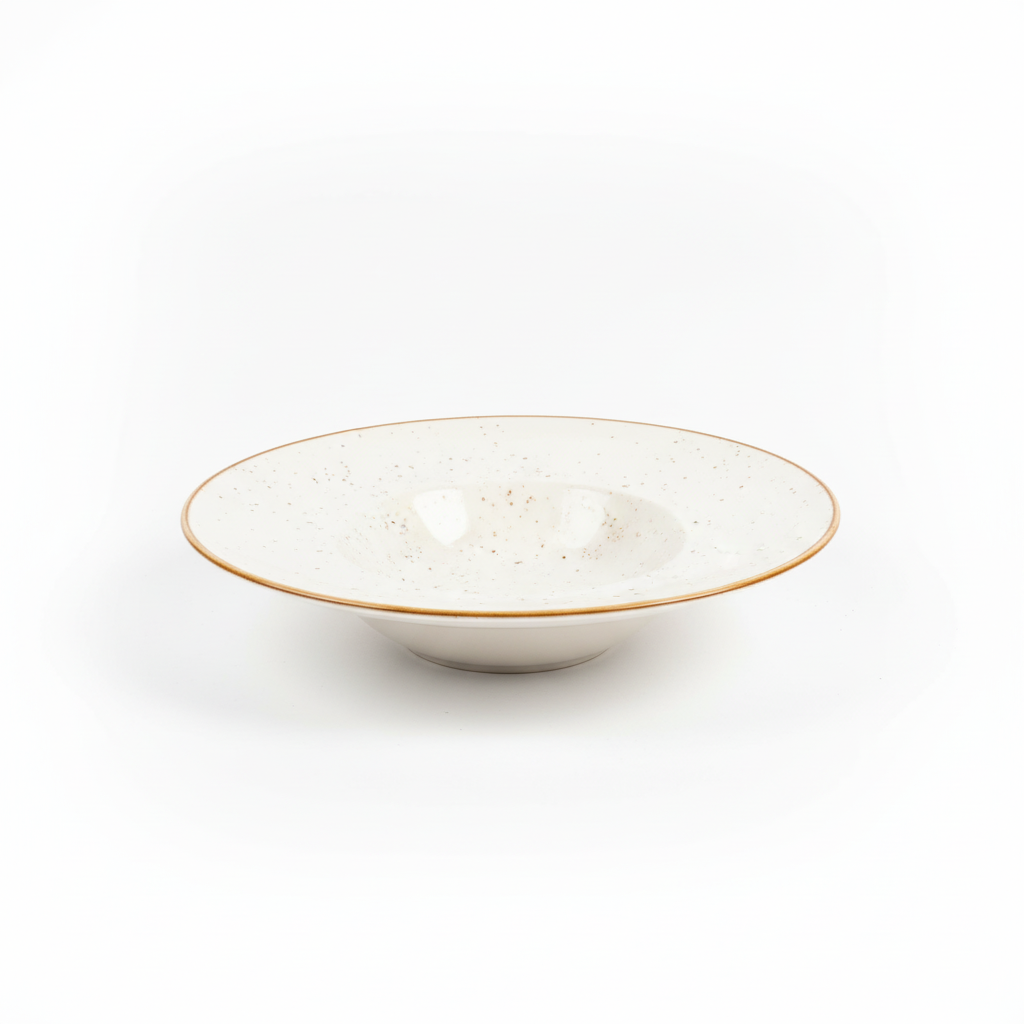 Pjata e thellë e Danny Home me dizajn me pika të imëta kafe sjell një stil të ngrohtë në shtrimin e tryezës, ideale për servirjen e pjatave të para, pastave apo supave. Përfundimi i bardhë me buzë kontrastuese e bën të dallueshme në çdo koleksion enësh.