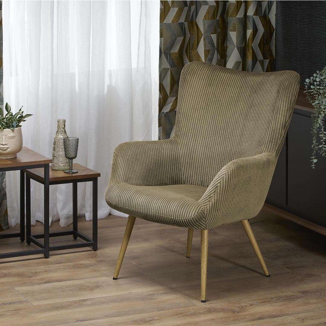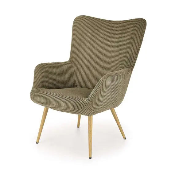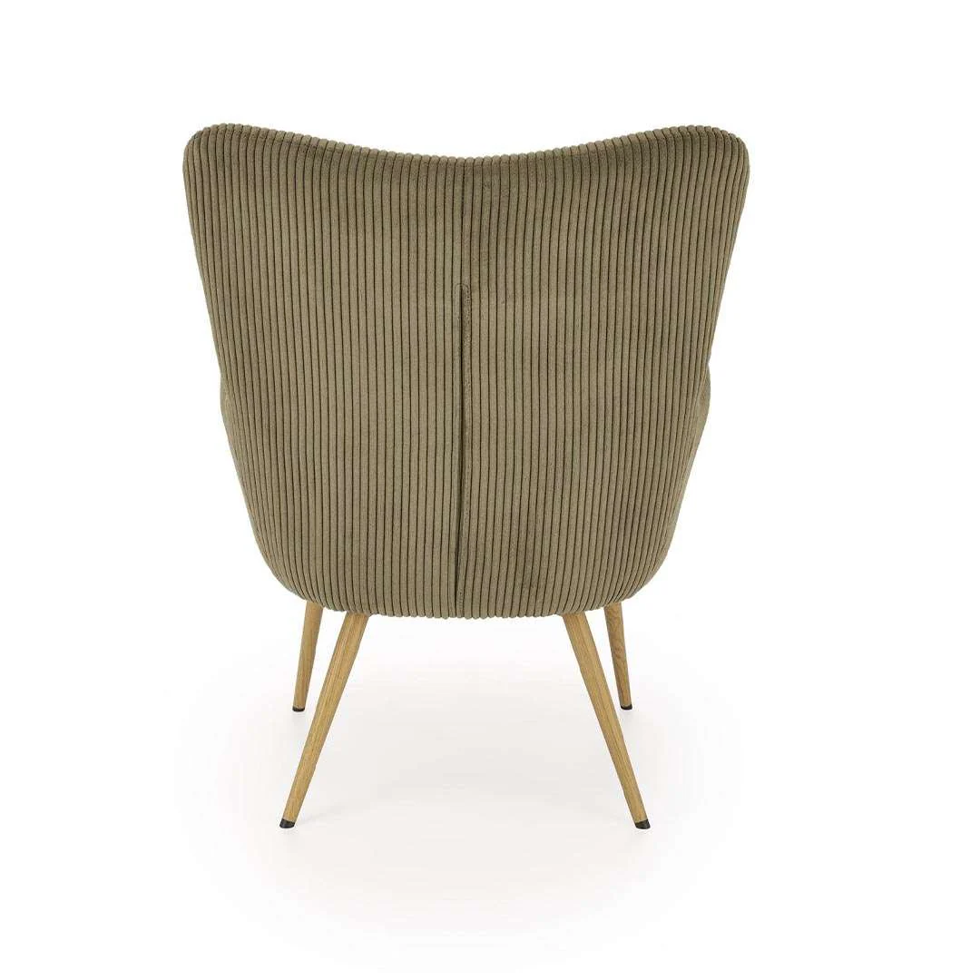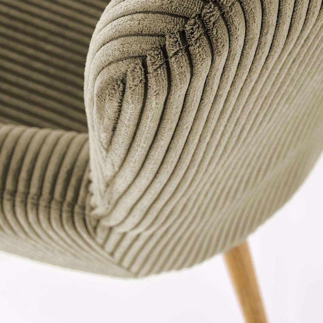 E veshur me pëlhurë kadifeje me vija, kjo poltronë ofron një teksturë të pasur dhe të butë që dëshironi ta prekni. Ngjyra e saj jeshile e zbehtë (Olive/Sage Green) është jashtëzakonisht e lehtë për t'u kombinuar, duke u shkrirë bukur si me arredimet moderne me ngjyra neutrale, ashtu edhe me ato industriale apo "boho".